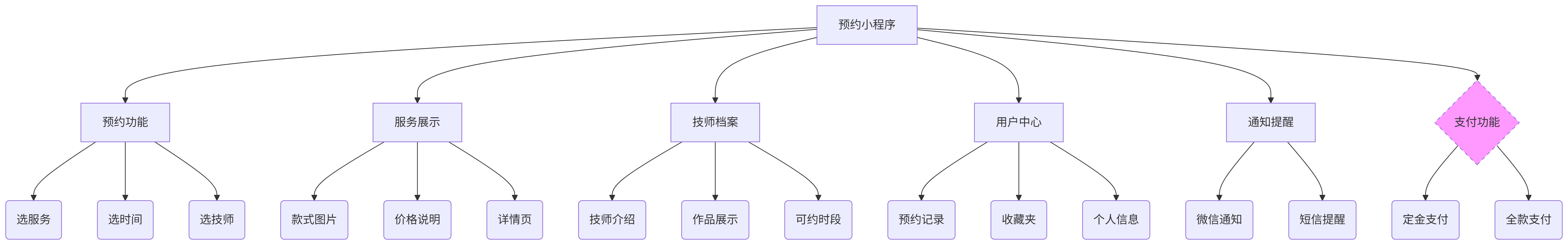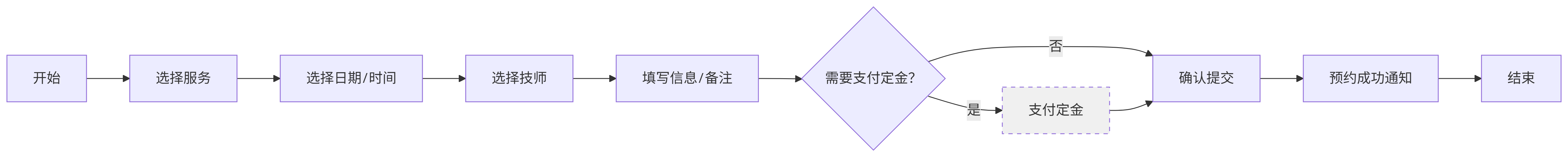 关键流程: 选服务 -> 选日期/时间 -> 选技师 -> 填信息/备注 -> 确认提交 -> (可选支付定金) -> 预约成功通知。这个流程必须顺畅无阻。